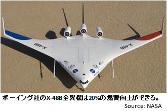 航空機の燃費は過去40年間に70%向上している。旅客機の燃費は1人の乗客を100km輸送するのに必要な燃料の量(リッター)で表わす。2005年には5リッターを達成している。リッター当たり20kmとECOカー並みである。2011年に就航したボーイング787は主翼を炭素繊維複合材(CFRP)にして軽量化を図りさらに20%の燃費向上を達成している。エアバス380は800人を運べ3リッターを達成している。写真の全翼機は低速機とも呼ばれ3000メートル程度の中高度を250km/hで飛行し燃費は20〜30%向上する。